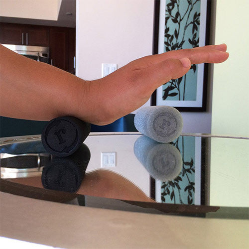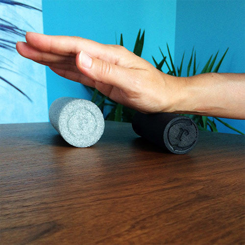 Kick it old + new school! This 2 Pack comes with two Rist Rollers - one soft and one firm. The 2" diameter soft Rist Roller is great for rolling out palms, wrists, + forearms. It's the roller that we launched with (hence, "old school"), is soft for comfort, but take note that it can give under pressure. The new kid on the block is our firm black roller which is great for both wrists + feet, + durable enough to travel with!